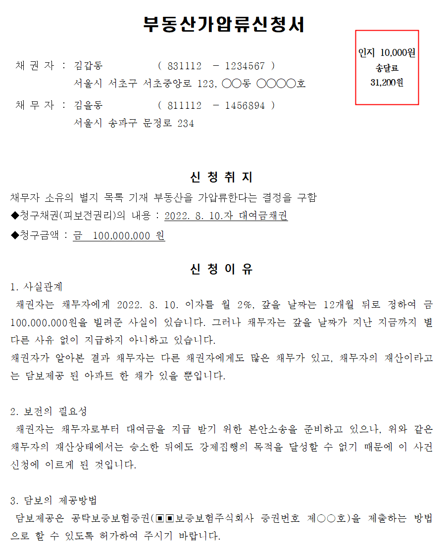 - 가압류신청서 작성 (청구금액과 사유 명시)