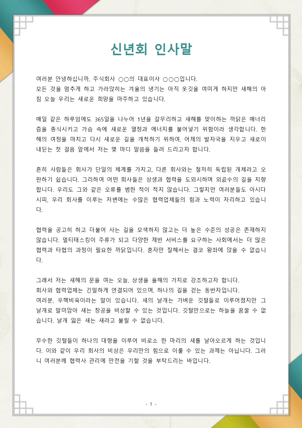 "존경하는 [회사명] 임직원 여러분, 2025년 새해를 맞이하여 귀사의 무궁한 발전과 임직원 여러분의 건승을 기원합니다. 올해도 함께 성장하고 발전하는 한 해가 되길 바랍니다."