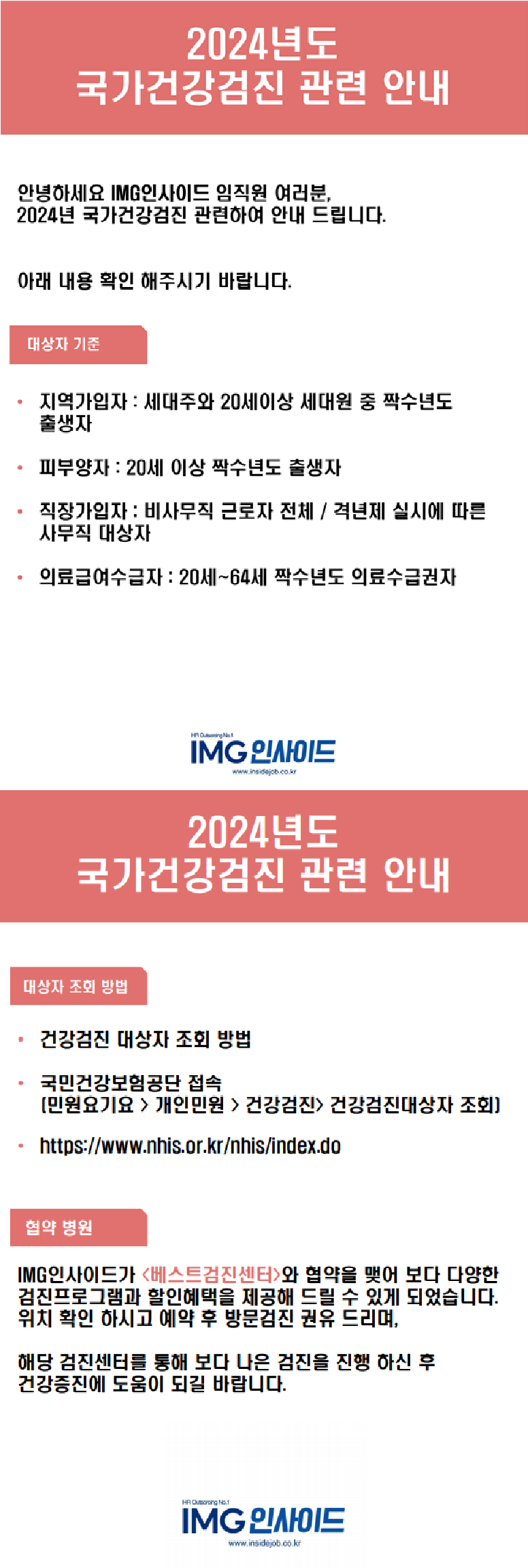 - 직장가입자의 경우 사무직은 2년에 1회, 비사무직은 1년에 1회 검진