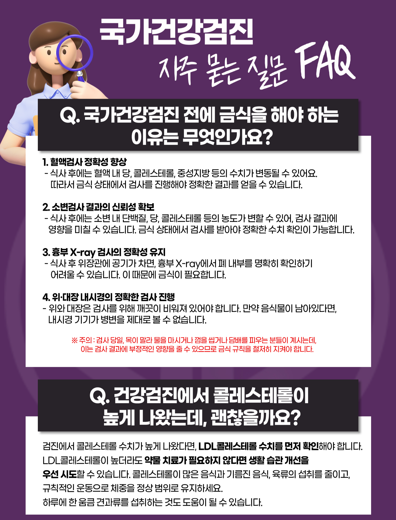 - 검진 전날 저녁 9시 이후 완전 금식 (최소 8시간)